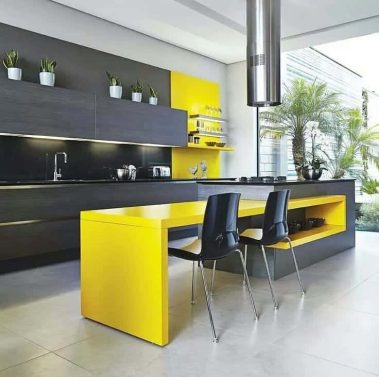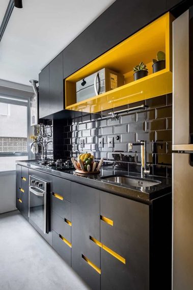 Cei care aleg această variantă îndrăzneață, folosesc de obicei nuanțe de negru pentru mai multe elemente de mari dimensiuni: fronturile și topurile de mobilier, accesorii precum chiuveta și bateria. Negrul poate fi ”diluat” cu mânere în finisaje metalice, plante verzi și pereți albi, luminoși.